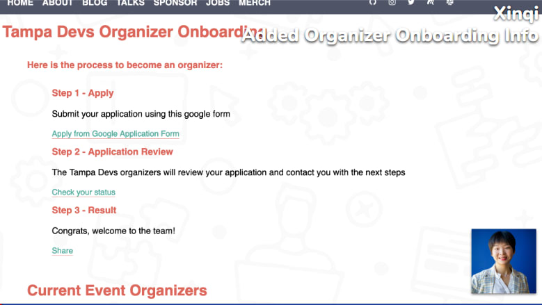 - Xinqi for adding organizer onboarding info.