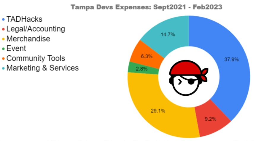 Our startup costs were substantial, but the overhead costs of running Tampa Devs are quite low. From September 2021 to February 2023, we spent the following amounts in various categories: